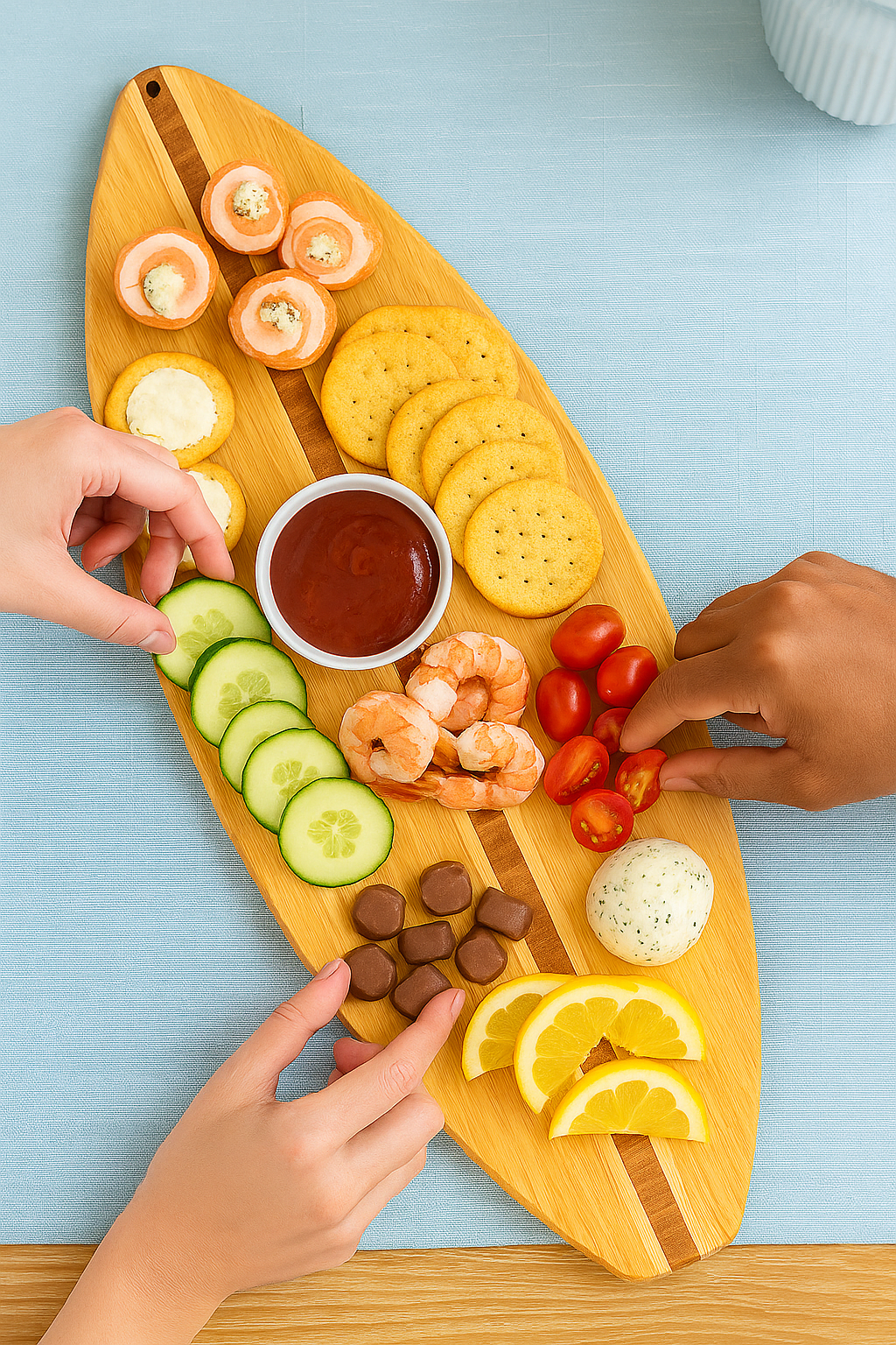 This beach picnic board is great for beach days, seafood boils, or any gathering with nautical vibes.