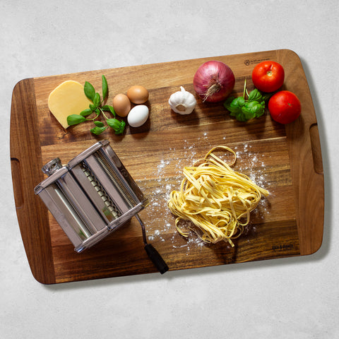 A good dough board should be large enough to comfortably roll out dough without it hanging over the edges of your board. That’s why carving boards make great dough boards! They tend to be larger and non-slip which makes them perfect for carving meats or rolling out your favorite pasta dough. Simply flip the carving board over and you have a noodle board that is flat with plenty of room to work your dough.