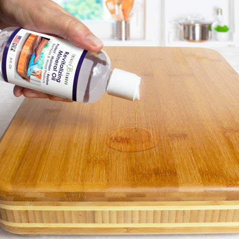 Food-grade mineral oil is the most widely used because it’s stable and won’t go rancid over time. Coconut oil or linseed oil may also be used as a substitute to mineral oil. Vegetable oil, olive oil and canola oil should be avoided as they can go rancid and leave your board with an unpleasant smell. If you’re looking for a food-grade mineral oil, we recommend our Revitalizing Oil.